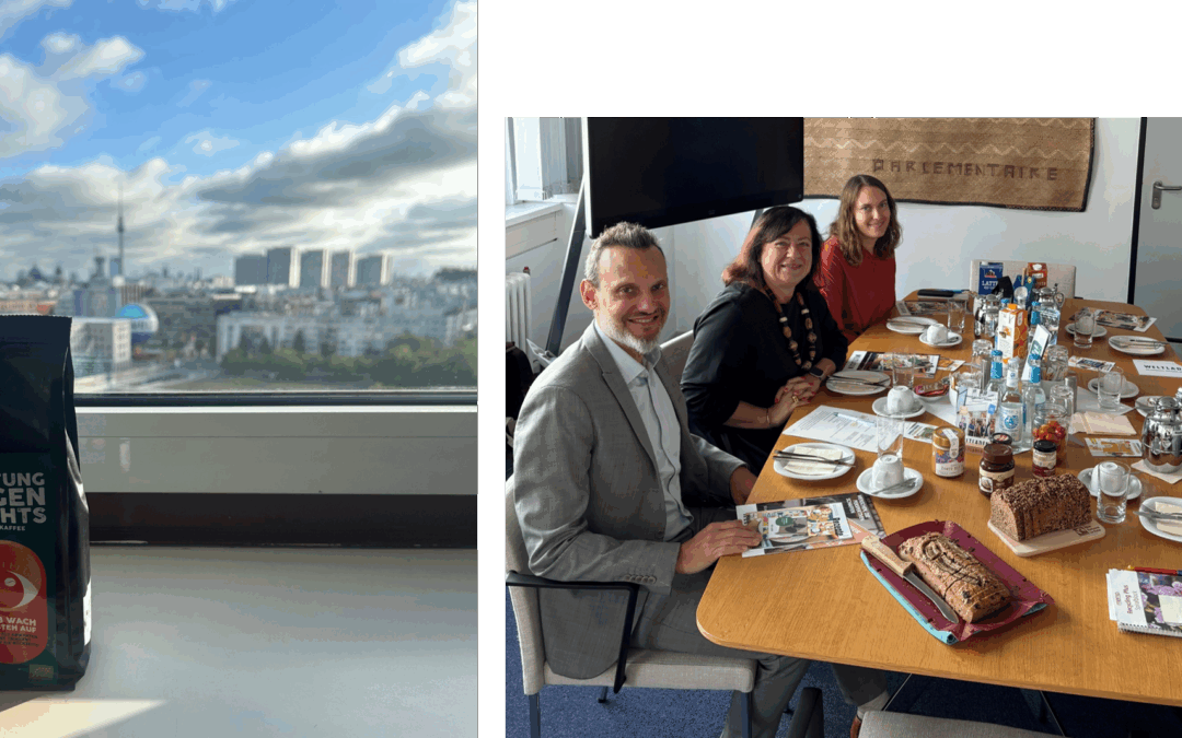 Unter dem Motto „50+50 Frühstücke an außergewöhnlichen Orten“ beteiligte sich der Weltladen-Dachverband an der Faire-Woche-Aktion zu seinem Jubiläum. Mit einem frisch gebackenen Bananenbrot und Leckereien aus dem Weltladen im Gepäck, wurden Vertreter*innen des Weltladen-Dachverbandes im Bundesministerium für wirtschaftliche Zusammenarbeit und Entwicklung in Berlin von Staatssekretärin Dr. Bärbel Kofler und zwei Mitarbeiter*innen des BMZ für ein gemeinsames Faires Frühstück empfangen. „Dabei hatten wir einen außerordentlich tollen Ausblick über Berlin, aber vor allem ein sehr interessantes und wertschätzendes Gespräch über die Anliegen der Weltläden. Wir sollen herzliche Grüße an die Weltladen-Bewegung ausrichten und euch allen eine schöne Faire Woche wünschen!“ berichtet der Weltladen-Dachverband in seinem Newsletter.